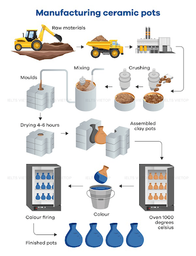 4. The diagram below shows one way of manufacturing ceramic pots. Summarise the information by selecting and reporting the main features, and make comparisons where relevant.