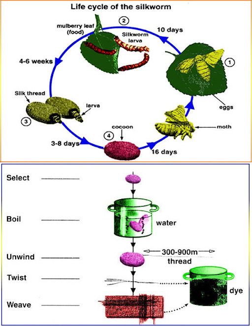 5. The diagrams below show the life cycle of the silkworm and the stages in the production of silk cloth. Summarise the information by selecting and reporting the main features, and make comparisons where relevant.