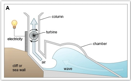 8. The diagrams show a structure that is used to generate electricity from wave power. Summarise the information by selecting and reporting the main features, and make comparisons where relevant.